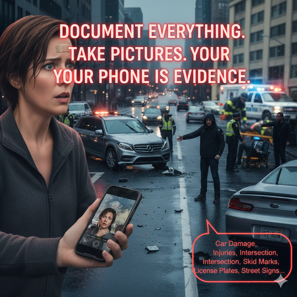 Evidence of damages and injuries is vital to a claim. This is especially true if a driver decides to pursue a lawsuit against the other driver's insurance to pay for damages. Cell phone cameras are a vital tool here. Take pictures of any damage to the vehicle and any injuries that can be photographed. It may also be a good idea to take photos of the other person's vehicle. In case they begin arguing about excessive damage to their car, there is evidence to refute it. If negligence or fault is likely to be in dispute, then a driver will want to take additional pictures of the accident as a whole, including its location, nearby cross streets, and buildings or anything that might be pertinent to determining fault. The driver can work later with their accident attorney or insurance representative to decide what is useful.